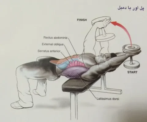 سپس هنگام بالا آوردن دمبل، آن را تا جایی بالا آورید که روی پیشانی شما قرار بگیرد. با انجام این کار بیشترین فشار روی عضلات لت خواهد بود و فشار روی سینه به کمترین حد خود خواهد رسید.