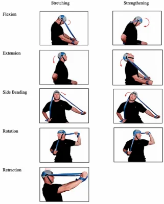 حرکات تقویت عضلات گردن مانند چرخش آرام شانهها به جلو و عقب، فشار دادن سر به دو طرف با دست و حرکات شانه انداختن