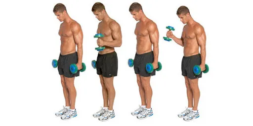 در هر یک از دست‌ها دمبلی بردارید و آنها را کنار بدن نگهدارید. کف دست‌ها را به سمت بیرون بچرخانید. ابتدا دمبل دست چپ را مثل چکش بالا ببرید. سپس وقتی دمبل به سطح شانه رسید آن‌را جلوی سینه ببرید و مچ دست را طوری بچرخانید که کف دست رو به زمین قرار بگیرد. حال در آن وضعیت دمبل را به سمت پائین بازگردانید. وقتی دمبل به بخش پائین حرکت رسید مجدد دمبل را کنار بدن ببرید. تکرار بعدی را با دست راست باید اجراء کنید و بعد از آن هم تناوبی تکرارها را دنبال کنید.